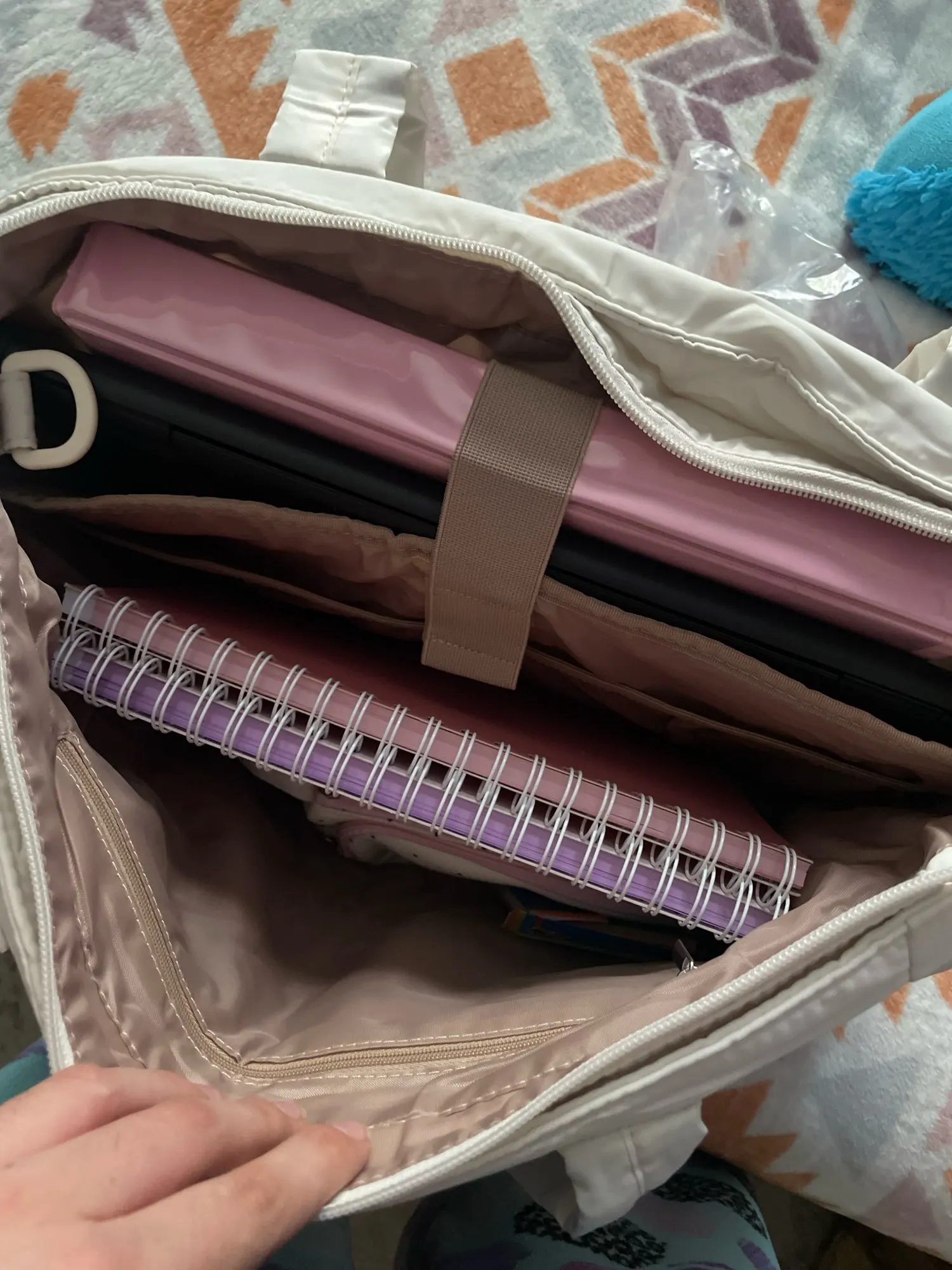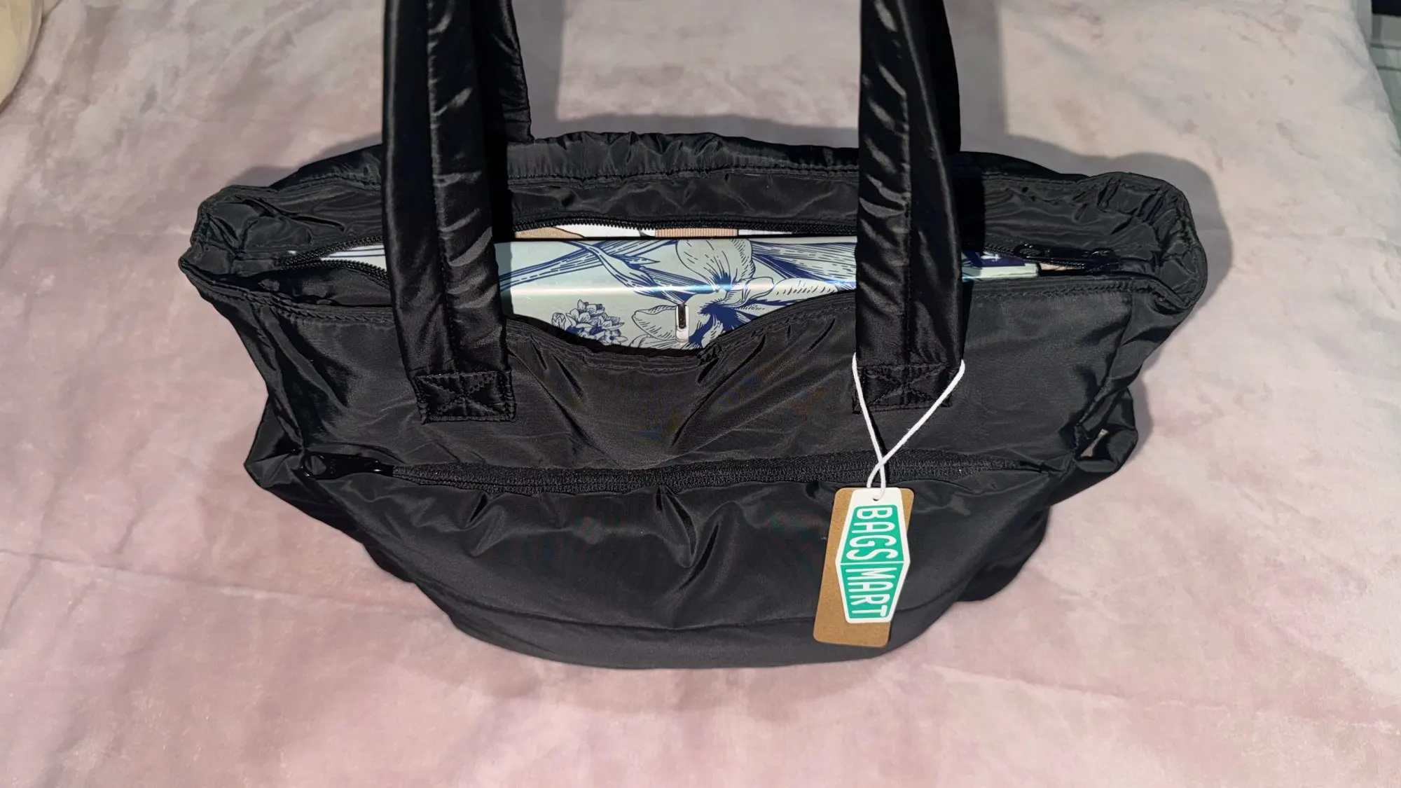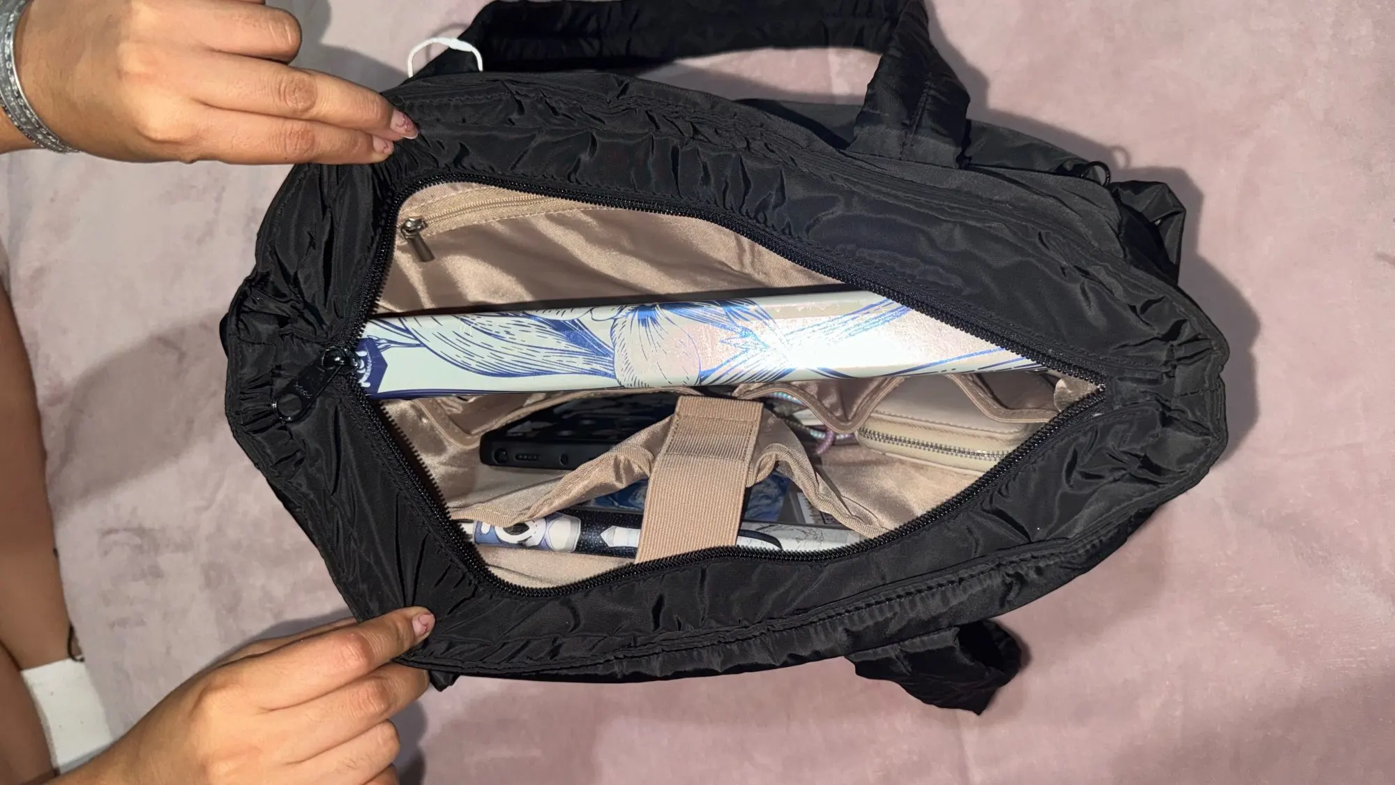 The bag is very beautiful, exactly as in the advertisement. It's quite spacious and fits a lot of things. It perfectly accommodated my laptop. It also comes with a larger strap, but to use that strap, the zipper must be open because it's inside the bag. If the strap were on the outside, it would be better, but it's not a problem for me because I'll only use the smaller strap, which is already very good and comfortable on my shoulder. There are pockets on the outside for bottles, and it fits mine of 1L but I think it can fit even bigger ones. It also has a pocket on the front outside that's super discreet. Anyway, it's very good and met expectations.